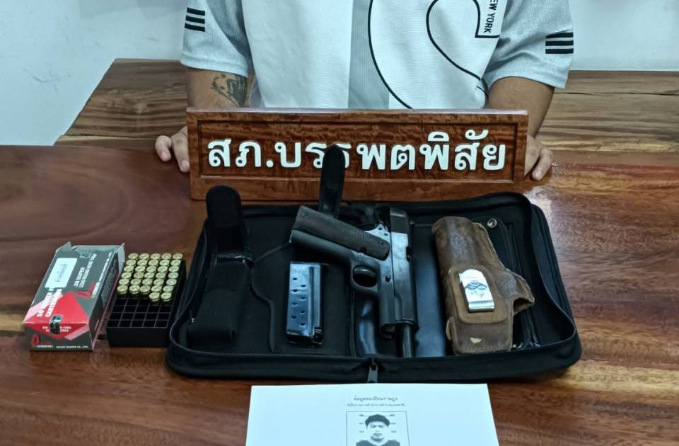 1.อาวุธปืนยี่ห้อLLAMA SPEIAL จำนวน 1 กระบอก 2.เครื่องกระสุนปืน 32 นัด 3.ซองกระสุน(แม็กกาซีน) จำนวน 2 อัน 4.ซองพกหนัง 1 ซอง 5.กระเป๋าใส่ปืน 1 ใบ